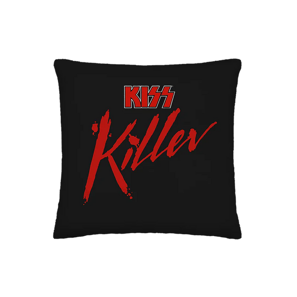 Black/white pillow featuring The Demon design on the front with red tongue and KISS logo with "Killer" blood splatter on the back.